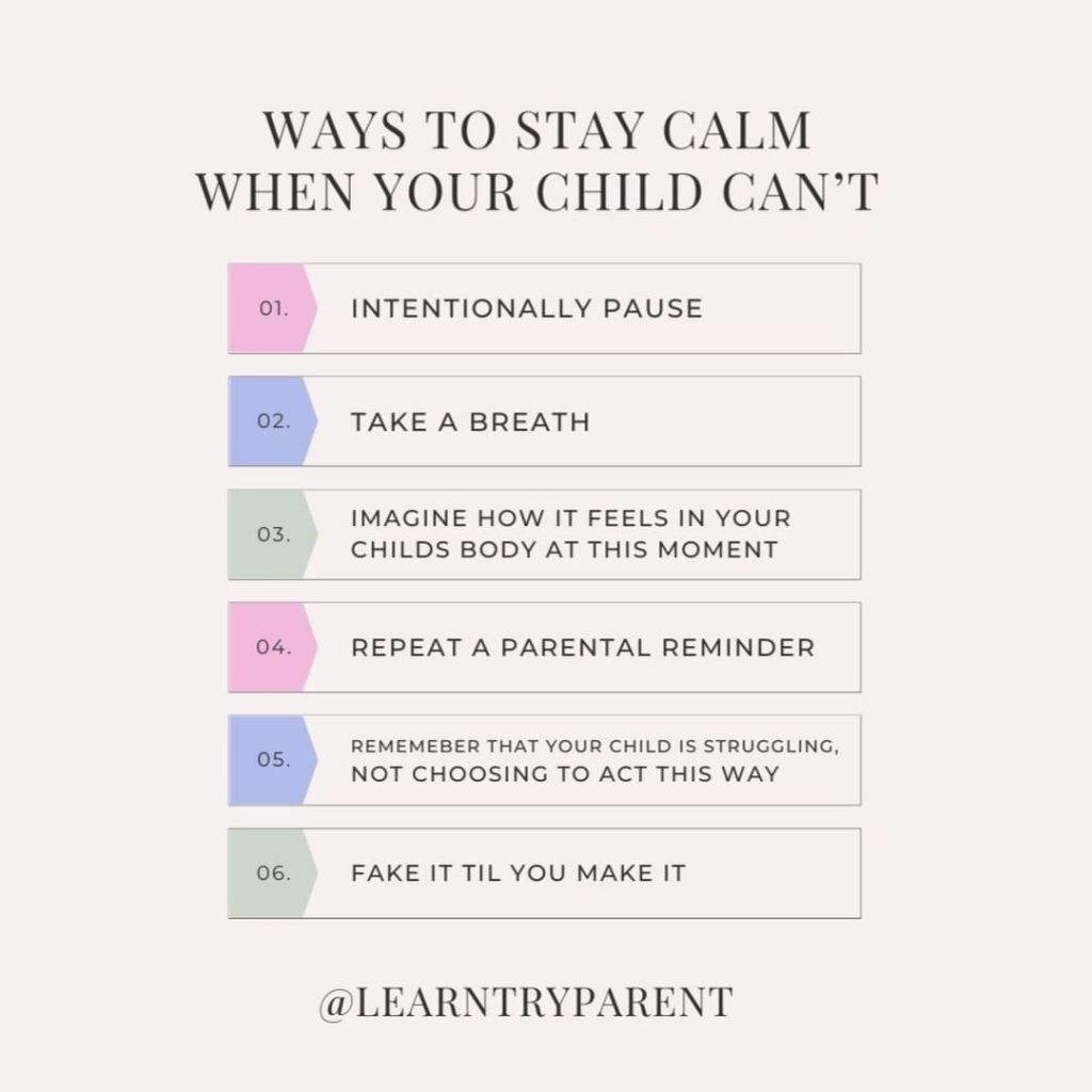 Skills like taking an intentional pause before reacting or breathing deeply. We can increase empathy by imagining the feelings of physical distress our child is experiencing. Creating a parental reminder to habitually repeat can help pull us from an emotional to a grounded response, much like remembering the developmental limitations of our child can.